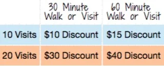 The Come, Sit, Stay punch-card is available for 30, 45 or 60 minute dog walks and in-home visits. Receive a fixed dollar discount when purchasing a punch card for 10 or 20 service visits. Discounts are available as follows: